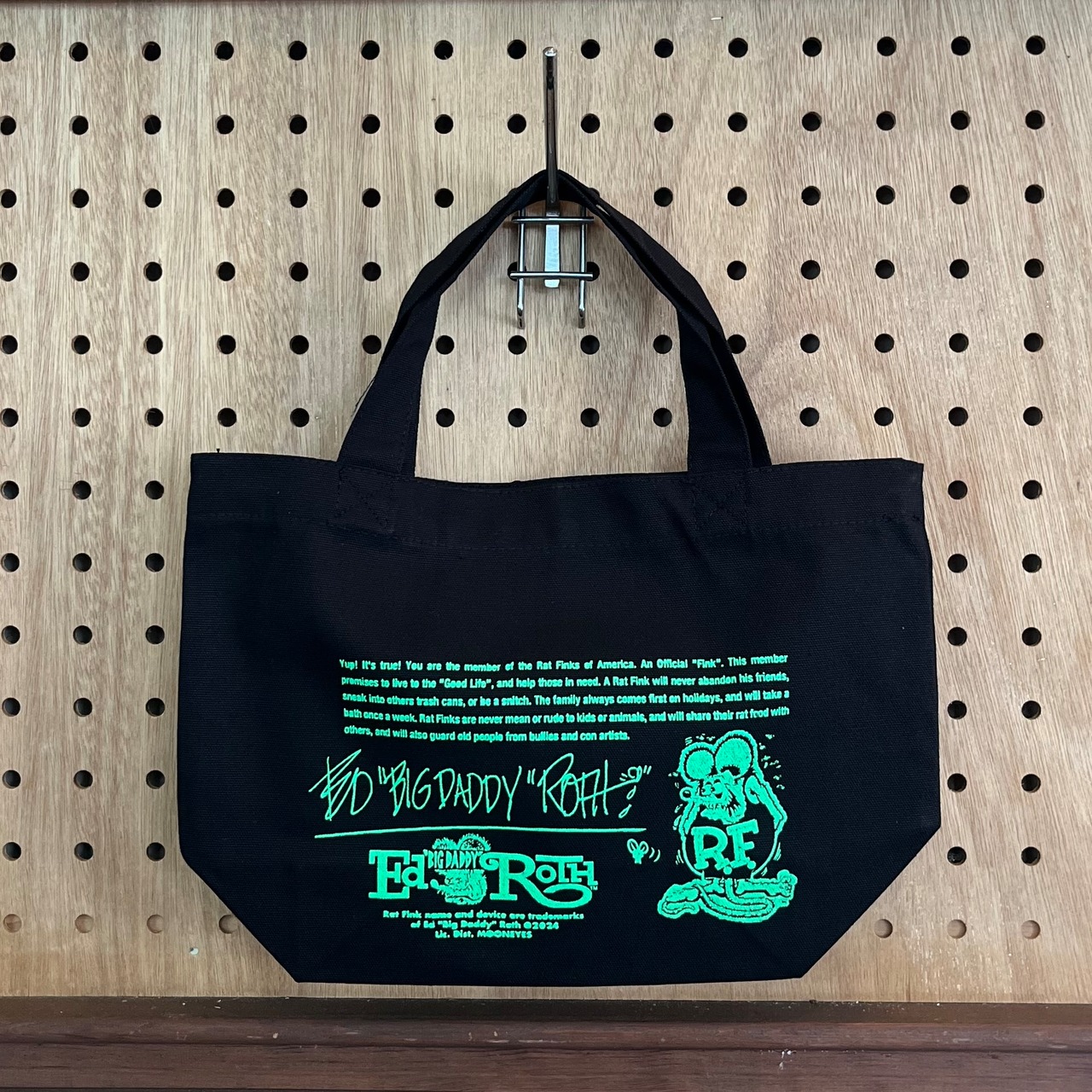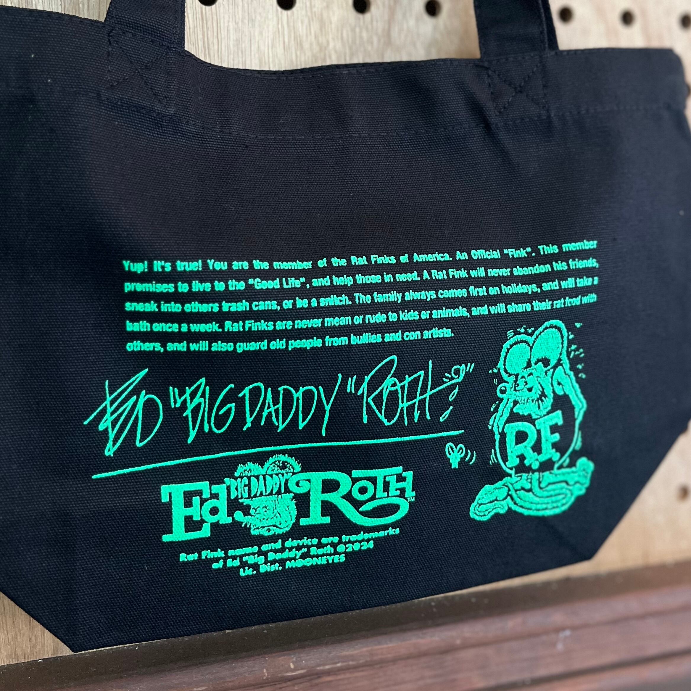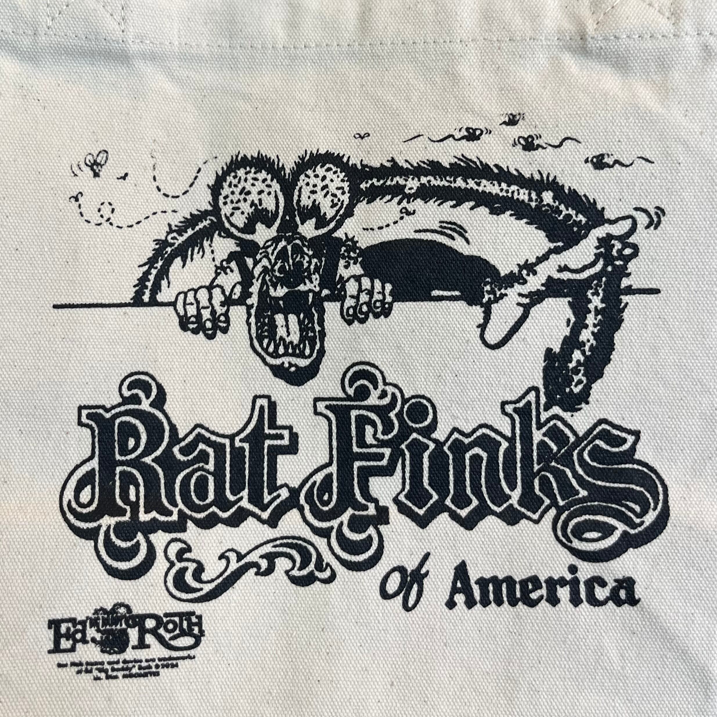 限られたオフィシャル“Fink”の人しか持っていないレアなRat Fink of Americaのmember Certificateのデザインを両面に落とし込んだミニトートバッグです。